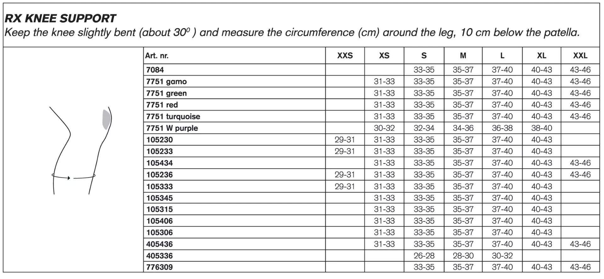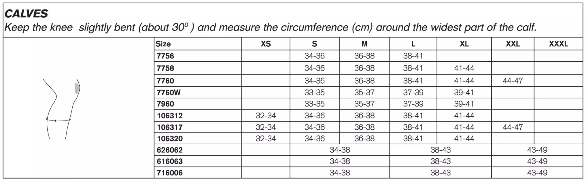 Masse:Umfang Wade ca.10cm unterhalb der Kniescheibe in cm, bei leicht gebeugtem Knie: